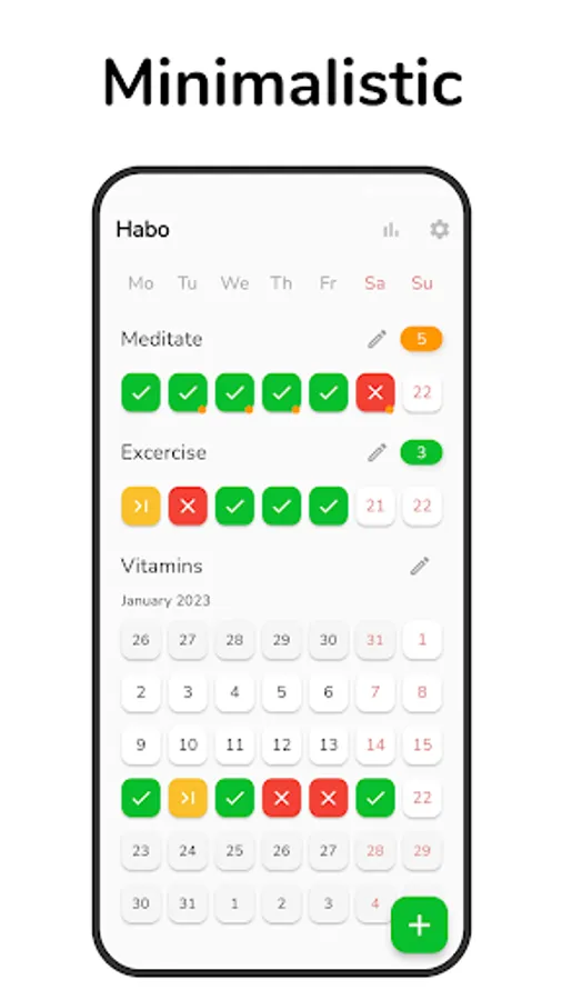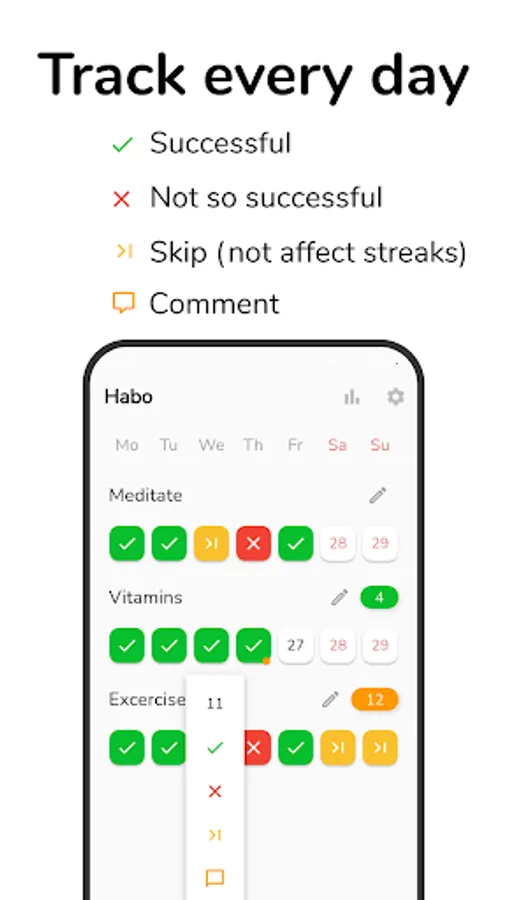 With Habo, you can customize your own habit list, set reminders, and add notes to help you stay motivated. Whether you're looking to improve your exercise routine, eat healthier, or simply adopt better habits, Habo is here to help you succeed.