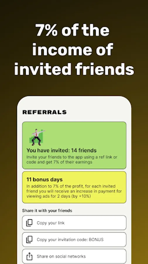 The application also has a referral system. You can invite your friends and receive 7% of the income they earn. This is a great way to increase your income and help your friends earn money.