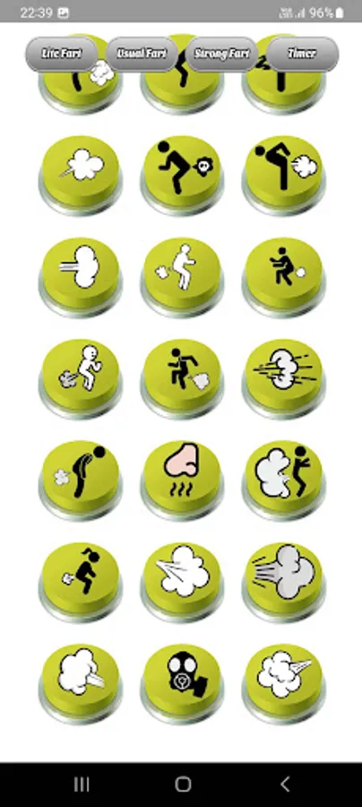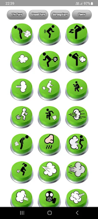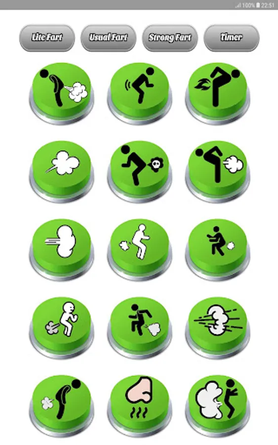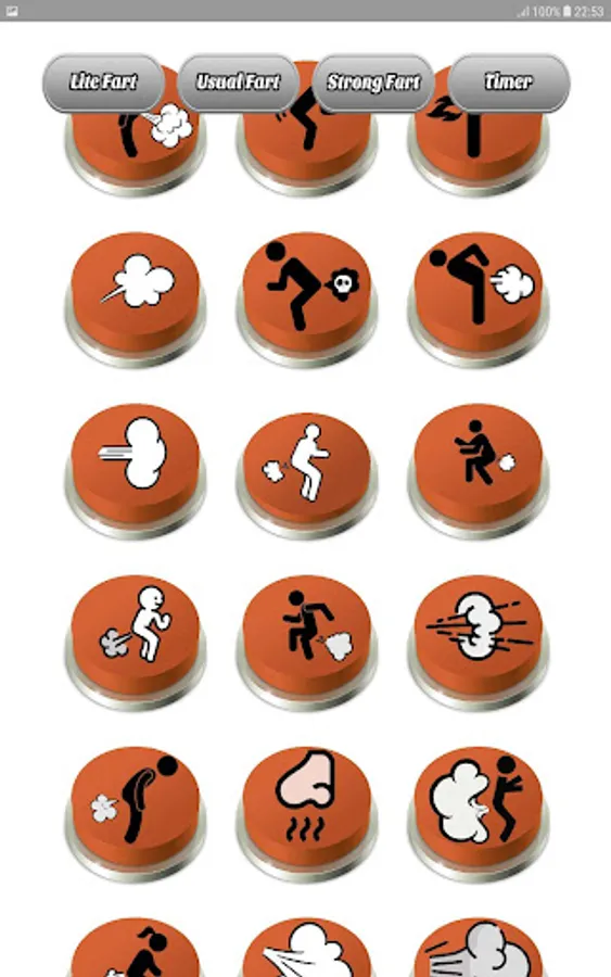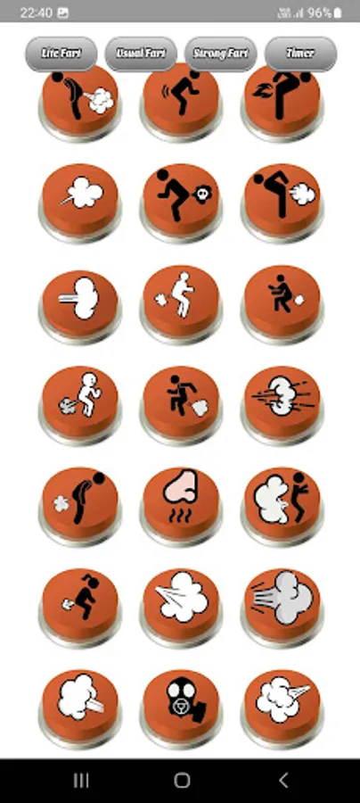With "Fart Sounds Buttons Soundboard," you'll have access to a variety of fart buttons conveniently organized into different categories. The top menu features four buttons, three of which correspond to separate sections of fart buttons, while the fourth button is the "Timer" button.