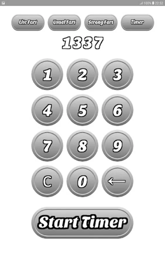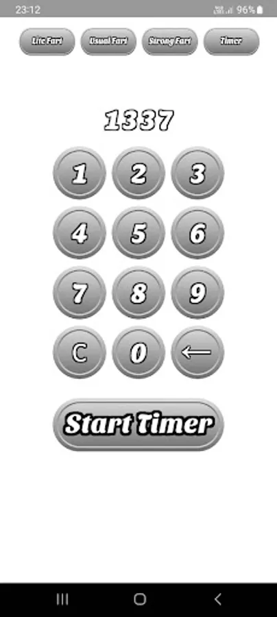 But that's not all! "Fart Sounds Buttons Soundboard" goes above and beyond by incorporating a handy timer feature. Simply press the "Timer" button, and you'll be prompted to select a fart button. Once you've made your choice, the app will transition to the timer menu. Here, you'll find a grid layout with buttons arranged in a 3x4 pattern. Below the grid, you'll see the "Start Timer" button. Enter your desired timer duration using the provided buttons and hit "Start Timer" to begin the countdown. Once the timer ends, the app will play the selected fart sound, adding an element of surprise and laughter to your day.