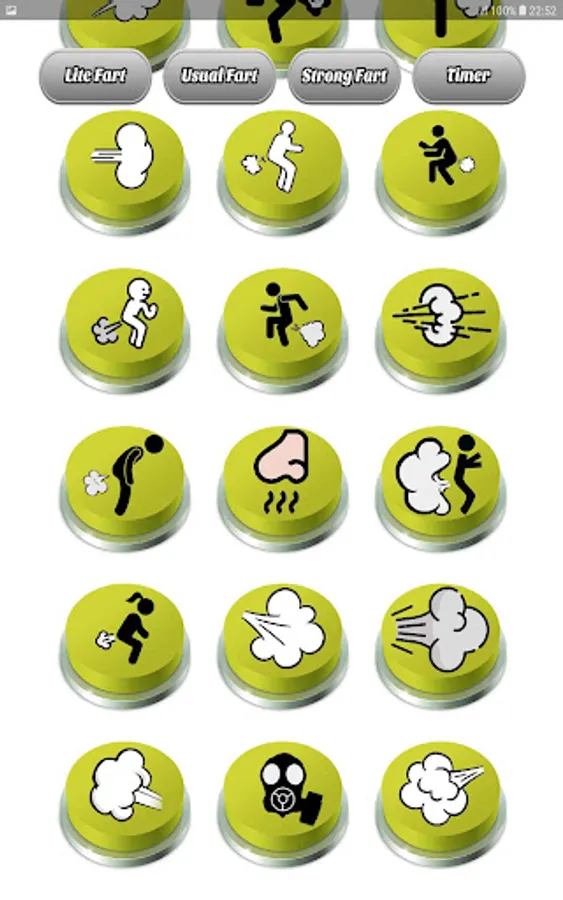 In the "Usual Fart" section, you'll find even more fart buttons to tickle your funny bone. This section is distinguished by yellow buttons, making it easy to locate your favorite fart sound.