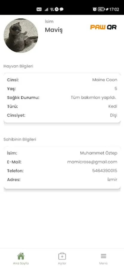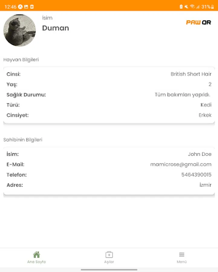 After defining a QR code for your pets, you can access your pet's information by scanning the QR code from within the application. You can change the information of the animal and the owner of the animal from the application.