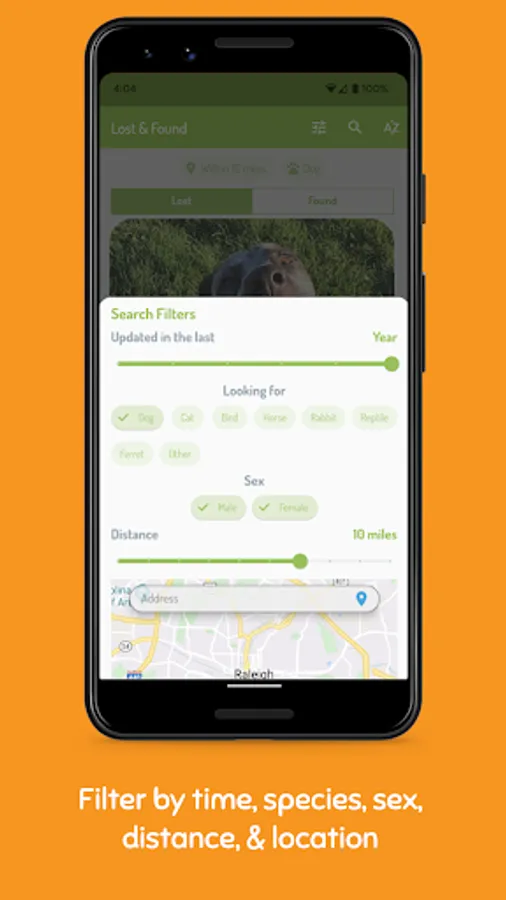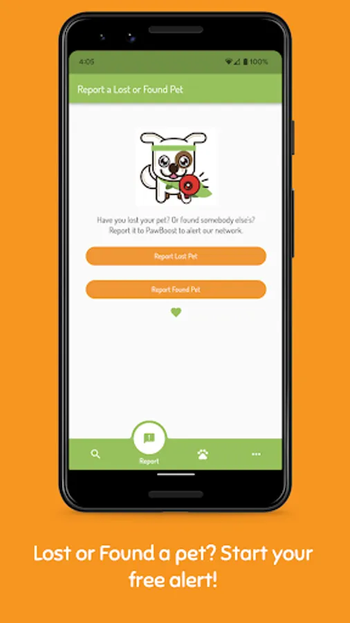 If you have LOST or FOUND a pet, you can report it by downloading the app, creating an account, then clicking the 'Report' button. Note: You will need a photo of your pet in order to complete the report.