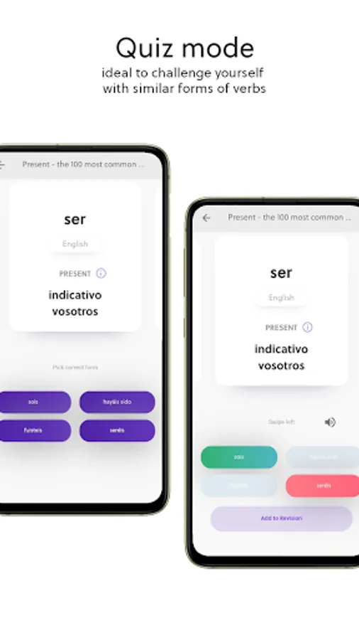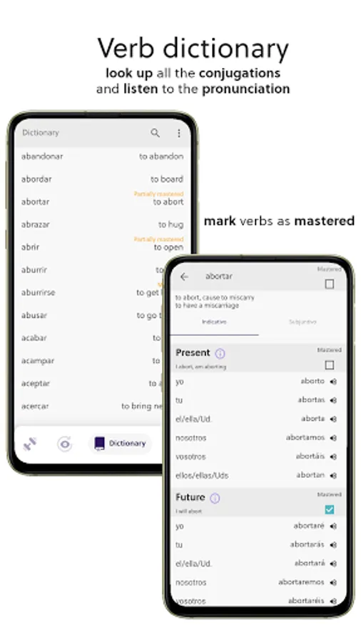 Our Spanish Verb Trainer app makes the process of learning and revising Spanish conjugations easy and pleasant. The app uses all the 16 Spanish tenses. You can specifically select the verbs you want to study (for a coming exam, for travelling etc).