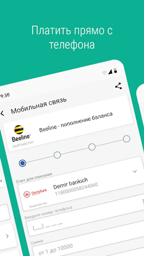 With the help of our payment system, you can make online payments to mobile operators, fixed lines, Internet services, utilities, television, etc. throughout the territory of the Kyrgyz Republic.