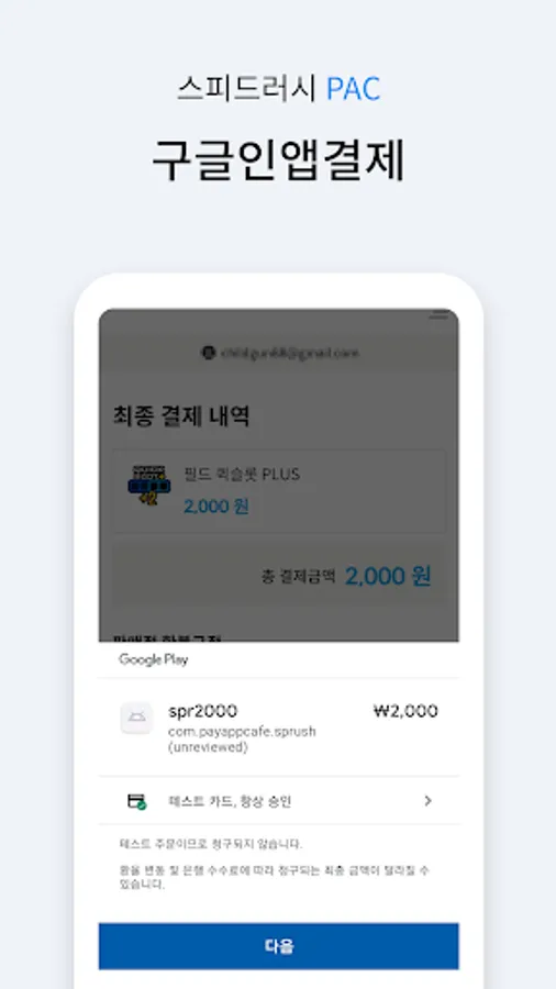 It is a game app for "Pay App Cafe" demonstration that supports both Google in-app payment and third-party payment for various mobile contents (app products such as games, webtoons, education, books, etc.) with one simple installation.