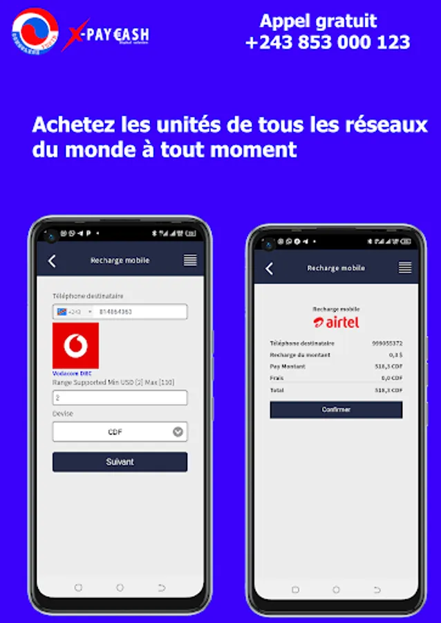 Achetez les unités de communication de tous réseaux du monde , taxes, réabonnements tv , billets d’avion, impôts, taxis, restaurants, hôpitaux, pharmacies, supermarchés, boutiques, hôtels, écoles, assurances, paiement de personnelle et bien d’autres services directement sur X-PAY CASH .