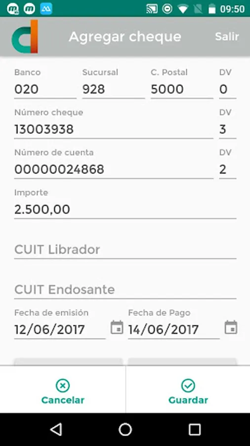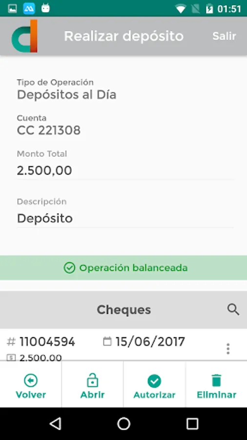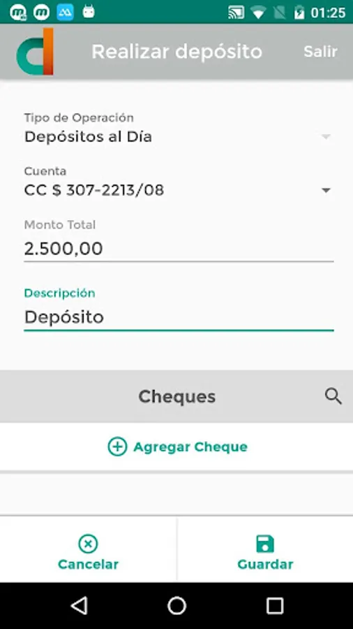 This application facilitates the deposit of checks, from images captured from the cell. Checks you send from the application weekdays until 16 pm. They shall be deposited in the day and you physically present in your office within 5 working days.