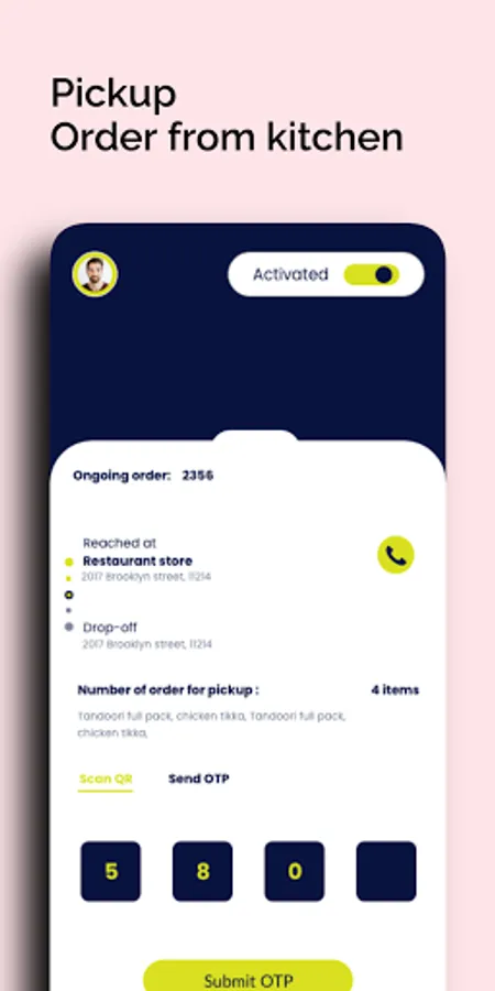 The app notifies you of any orders and provides GPS location to the kitchen, Scan you order and follow the delivery instructions