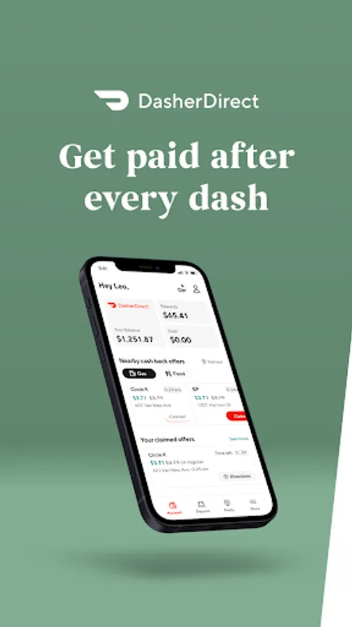 DasherDirect is a prepaid debit and mobile banking app for US-based Dashers, powered by Payfare. It provides Dashers with no-fee payouts after every dash, access to convenient banking functionality, and cash-back on gas, dining, groceries, travel and more.