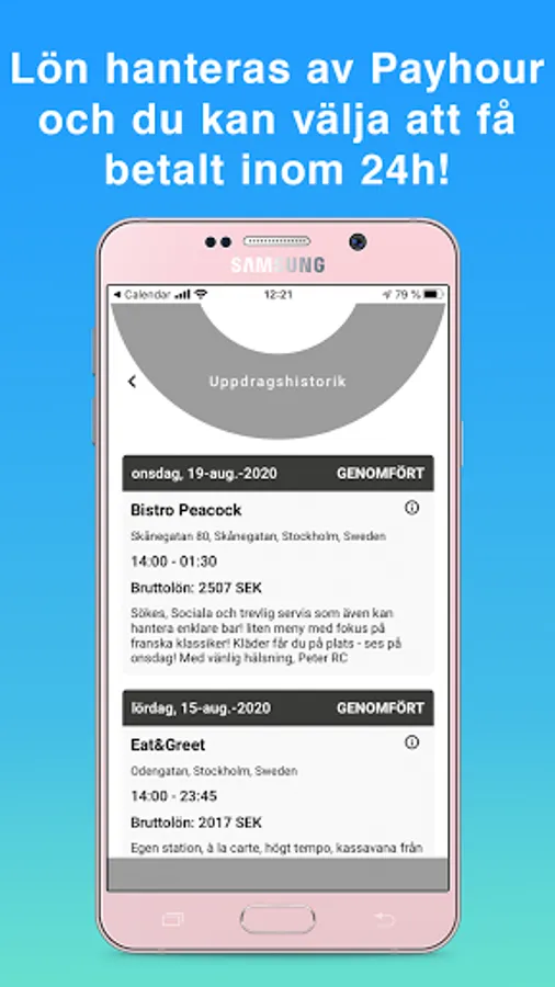 Payhour matchar personal som vill jobba extra med restauranger som behöver extrapersonal. Restauranger skickar förfrågningar till dig baserat på din tillgänglighet, CV och rating. Du väljer själv om du vill ta uppdraget eller ej. Allt styrs enkelt via appen, Payhour hanterar all administration och löneutbetalning. Oavsett om du är kock, kallskänka, servitör/servitris, bartender, diskare eller frukostbiträde erbjuder vi dig: Riktigt bra lön och möjlighet till lön inom en bankdagVälj själv när och var du vill jobba via appenDu styr din tillgänglighet via schemat i appen, du får bara uppdragsförfrågningar på dagar du själv valt att göra dig tillgänglig Payhour hanterar all administration och löneutbetalningGratis och enkelt att ansluta dig till Payhour