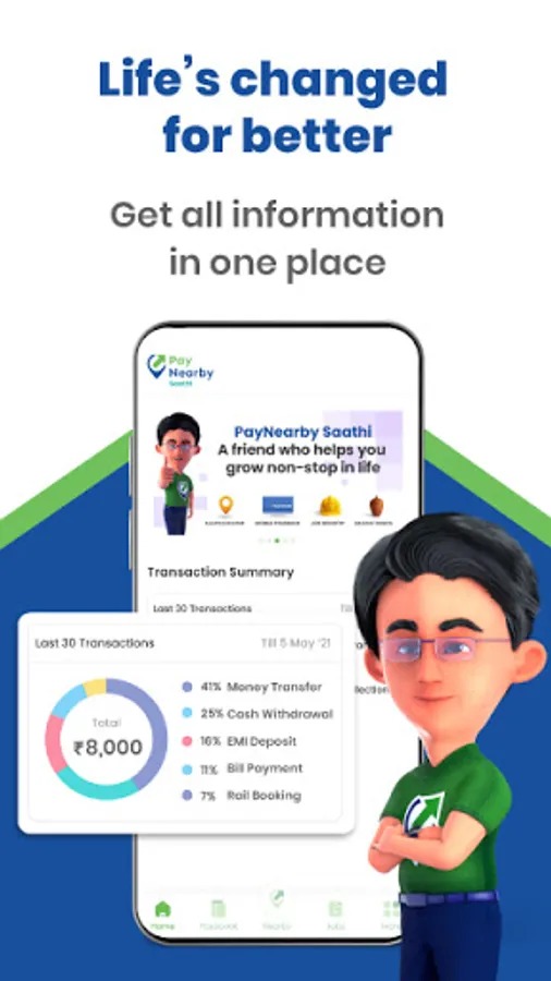 Ab all-in-one PayNearby Saathi app ke saath zindagi huyi aur behtar. Ek dost jo aapki madad karta hai sabhi transactions record maintain karne mein, naukri dhoondne mein, bhavishya ke liye bachat karne mein aur aasaan reminder bhejta hai taaki aap apna koi commitment na bhoolein.