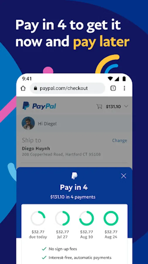 Loans to California residents are made or arranged pursuant to a California Finance Lenders Law License. PayPal, Inc. is a Georgia Installment Lender Licensee, NMLS #910457. Learn more at paypal.com/payin4