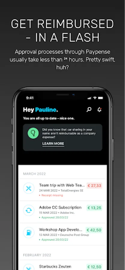 Employees receive a debit card and an app that can be used to apply for funds in real-time. This results in budgets that can be defined in terms of amount, occasion and duration.