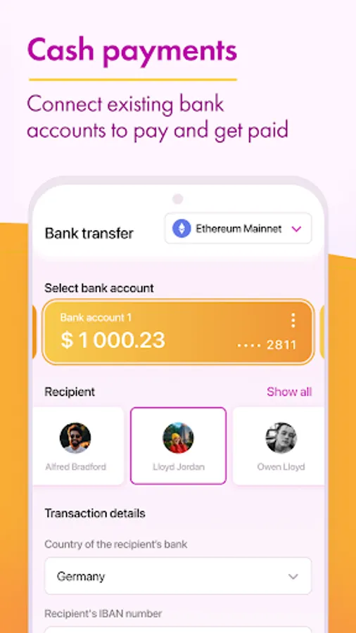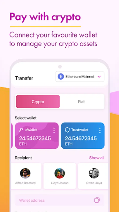 payments. Send and receive money securely either in your crypto wallets or existing bank