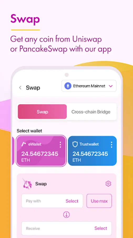 • Swap crypto coins available on Uniswap or PancakeSwap