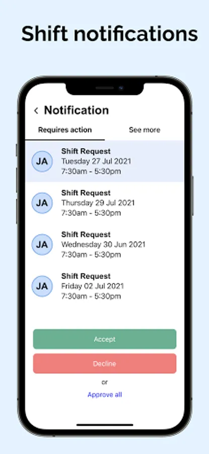 Shift notifications: You're notified when you're assigned a shift, a shift changes or your shift is cancelled. Accept or decline shifts directly from the app. Your employer will be notified depending on the choice you make.