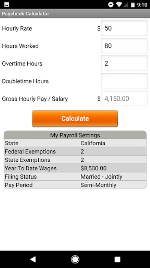 Paycheck Free payroll calculator will calculate payroll taxes for all 50 states and District of Columbia. Enjoy it and please rate the app if you like it. If you don't like it or desire improvements email us at support@payrollguru.mobi and we will try to make it better.