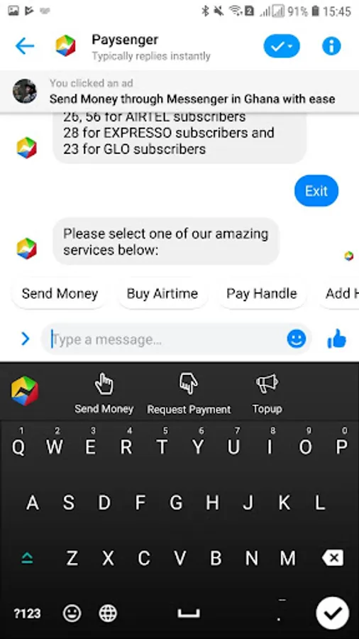Money conversations already happen on all social media platforms. Why take the transactions out? Paysenger enables you to send and receive money, pay for goods and services right in the middle of conversations. Whether it’s on WhatsApp, SnapChat, Instagram, Facebook, Skype, Hangout, Telegram, iMessage or even Text Message, you can transact, transfer money, pay for goods instantly without exiting your messaging App. Try it today. Paysenger - Chat, pay, play!