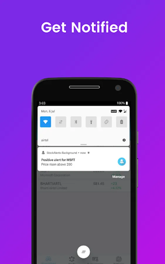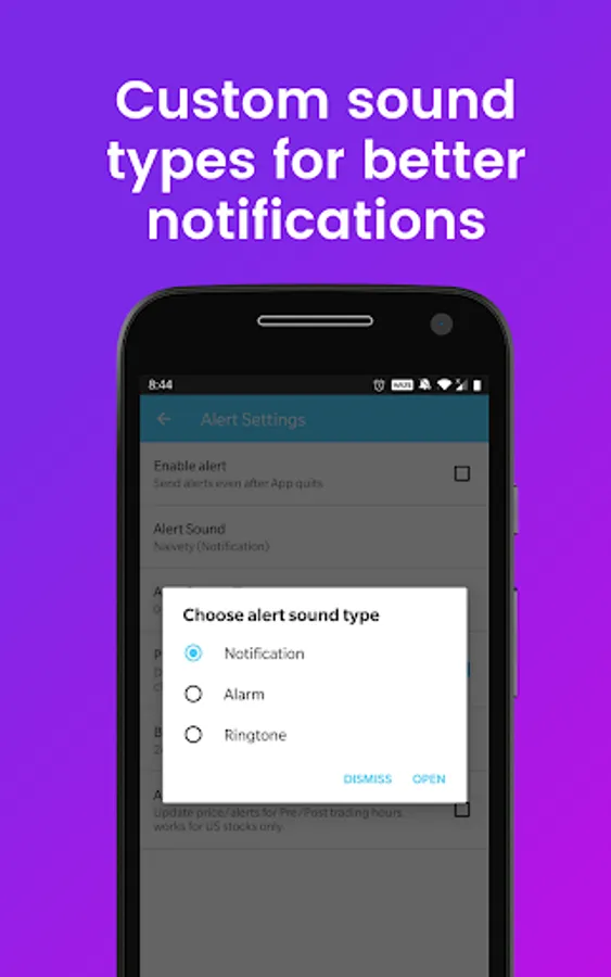 Stock Alerts offers extended hours alerts for the US market and set custom sound types like Alarm, ringtone or notification tones for your Stock alerts.