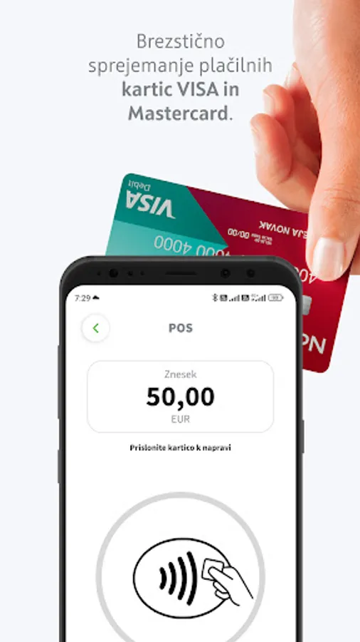 Accept contactless payments with VISA and Mastercard cards anytime, anywhere, using the Smart POS Nova KBM application on your Android mobile device. Quick. Secure. Anytime.