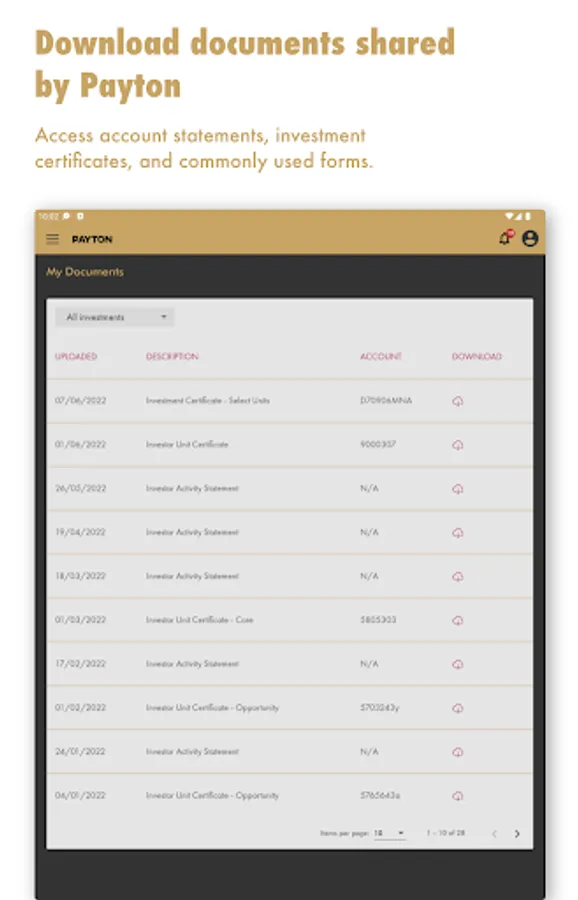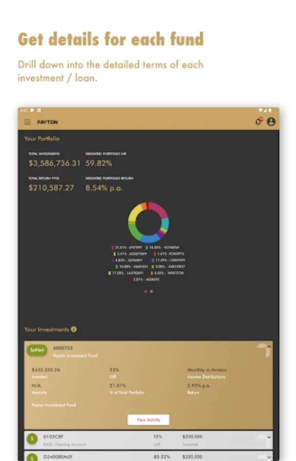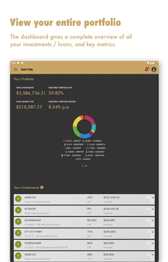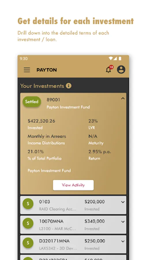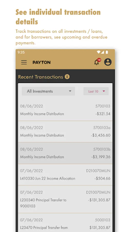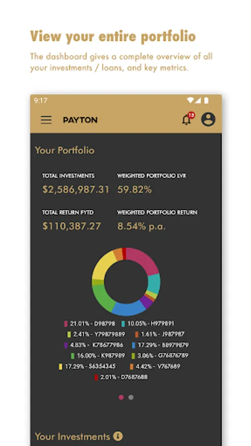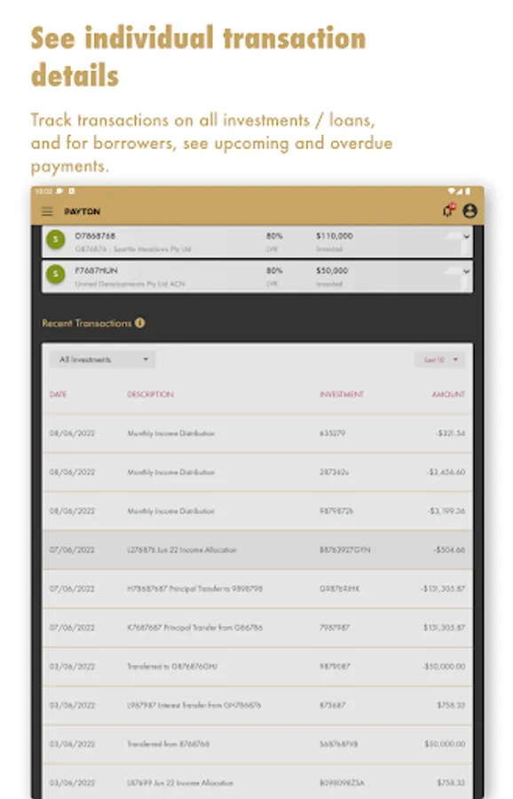 The Payton App provides clients with secure access to their current and historical investment and borrowing portfolios, and real-time transaction details. It gives up-to-date performance information and allows clients to download account statements and forms. Investors can view and express interest in current investment opportunities. Borrowers can also view any upcoming or overdue payments.