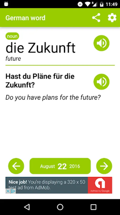 The app displays, for each day of the year, a word and an example sentence of the word, with a human-voiced sound of how to pronunce both the sentence and the word, helping to improve the student's pronunciation.