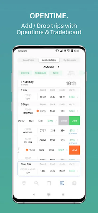 Crewline makes it very easy to see open time and trade board. It sorts them by the total available trips per day and you see them right on your calendar. Tap on them and you’ll be presented with an organized list of trips that are already sorted for you.