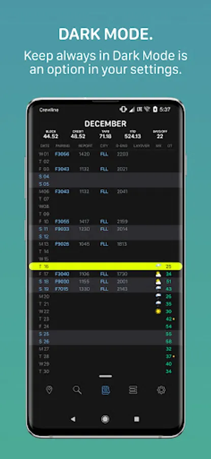 When you start your pairing, you will be presented with flight status information as well as the gate which you should report to. You’ll also notice a flight status indicator (green = on time, yellow = delayed, red = canceled) right next to each flight for the day.