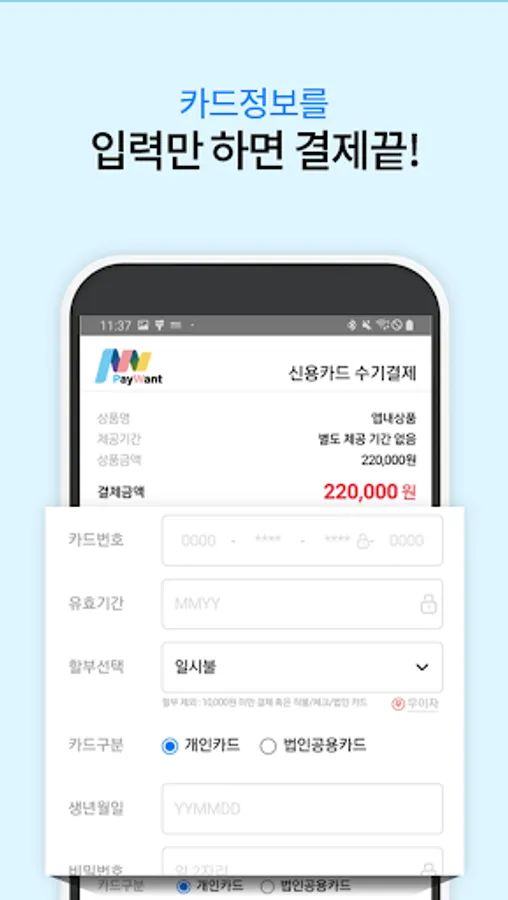 1. Manual payment: This is a service that allows you to easily pay by card with your card number/expiration date (customers can pay immediately without having to sign up for membership or install an app/certificate)