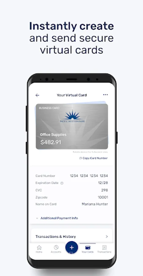 Pacific Western Bank Commercial Card customers can now make and manage business payments with the PWB Virtual Card app. In this easy-to-use app, you can instantly create and send secure virtual cards to anyone in your network, improve oversight of spending, and automate reconciliation. It’s absolutely free for businesses with no commitment.