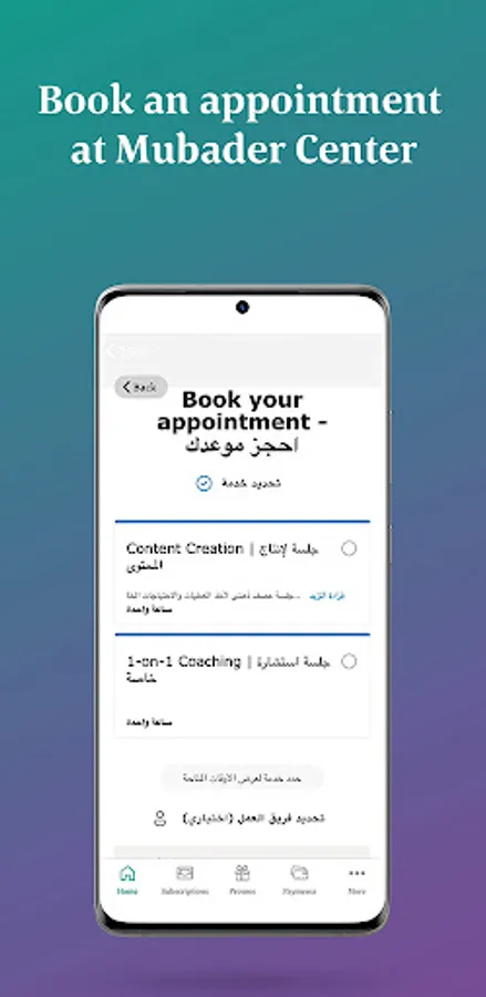 3. Through the app there is a scheduling system that allows you to book any of the facilities or services offered by Mubader Centre. The Centre includes facilities like meeting rooms, a media room and a business lounge. And services include one-on-one coaching, content creation services and much more.