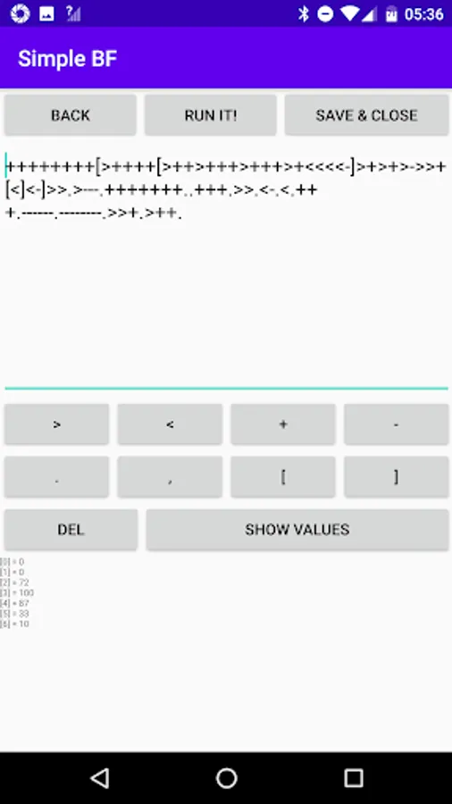 Interpreter for an esoteric programming language created in 1993 by Urban Müller. Language use only 8 chars: > < + - . , [ ]