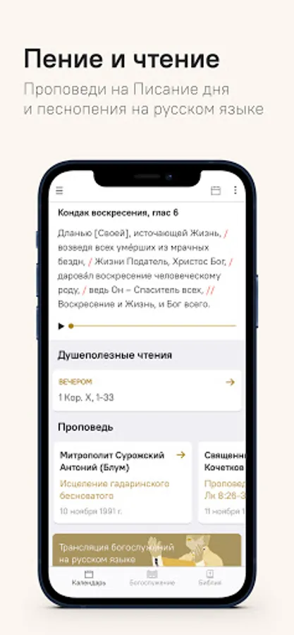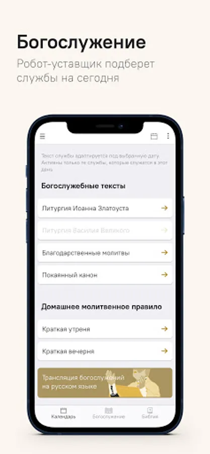 The content of the application will be constantly updated, and its pleasant design will allow you to quickly enter the spirit and meaning of Orthodox worship.