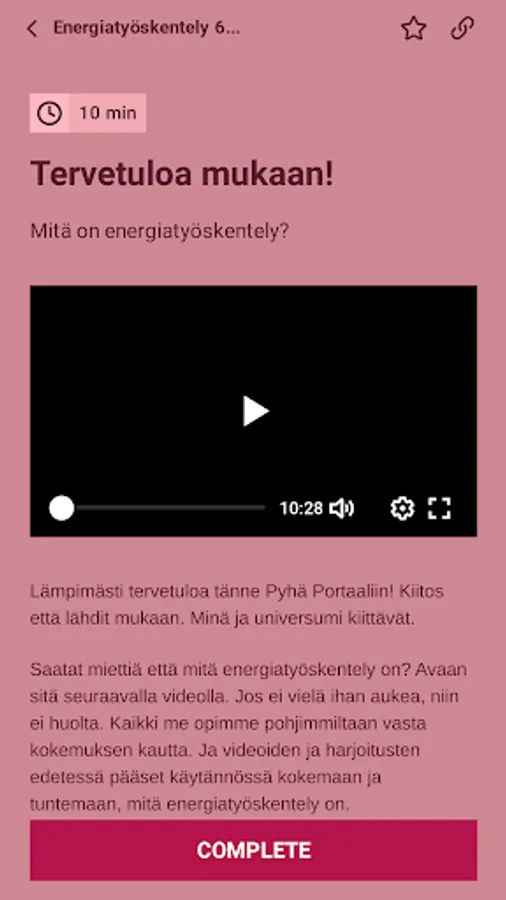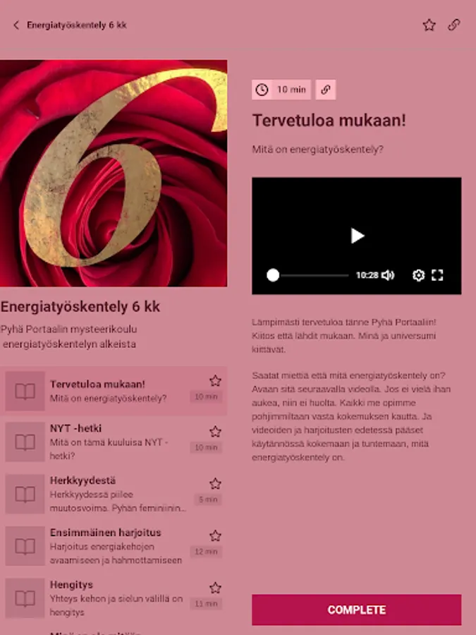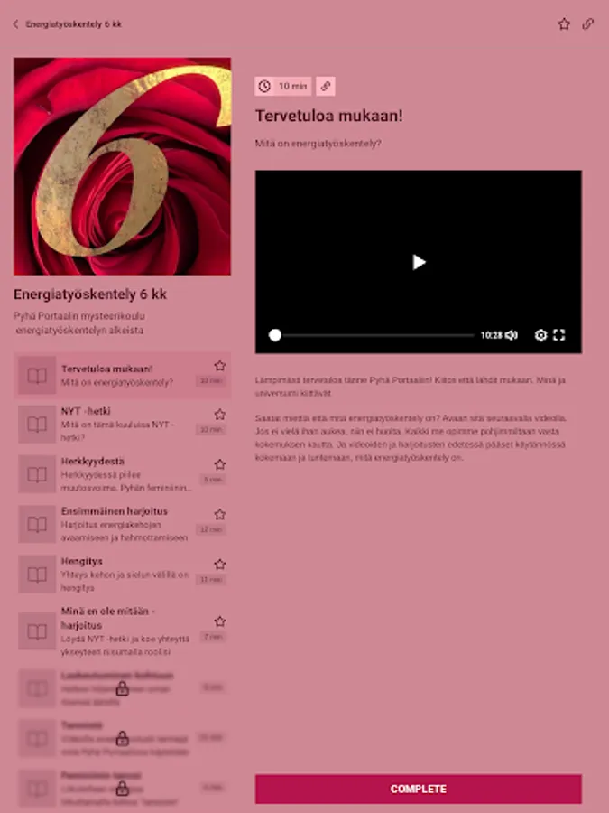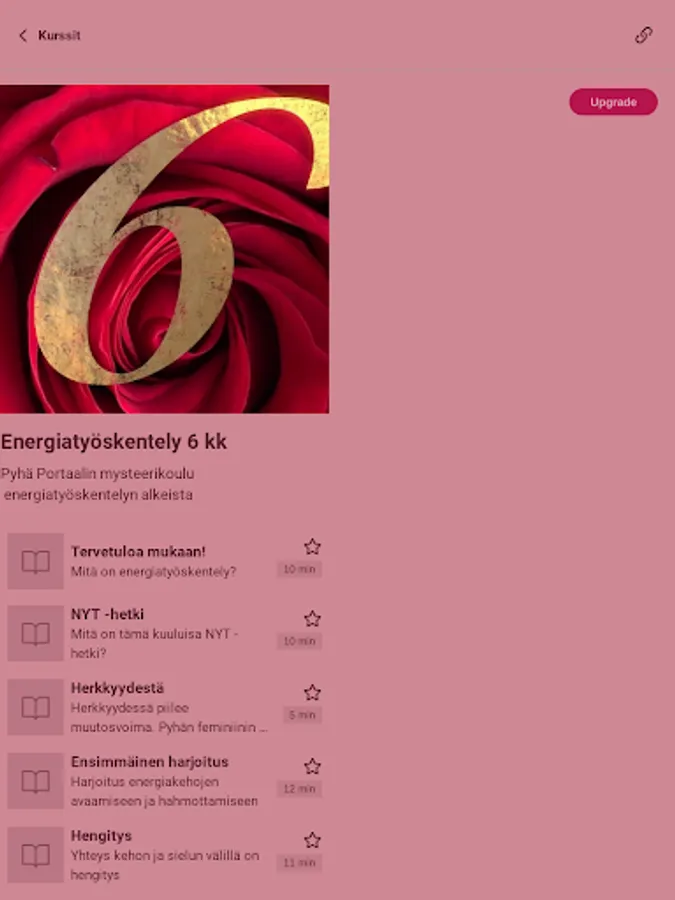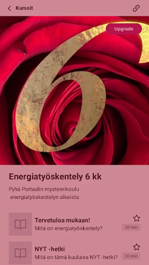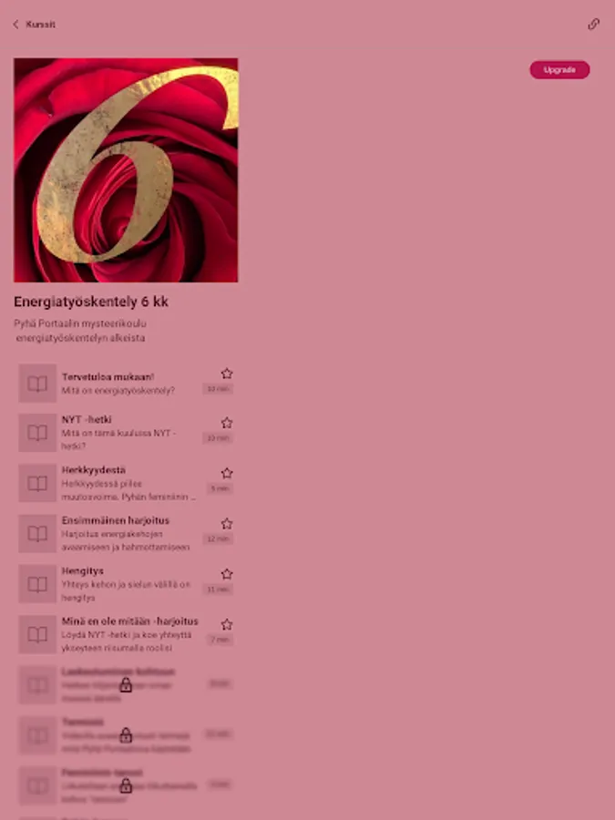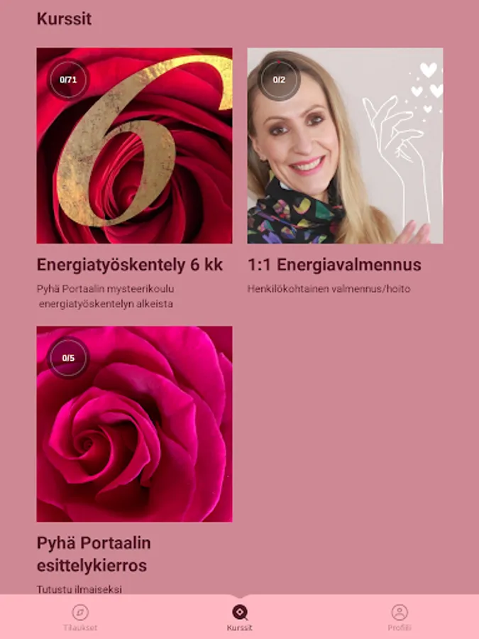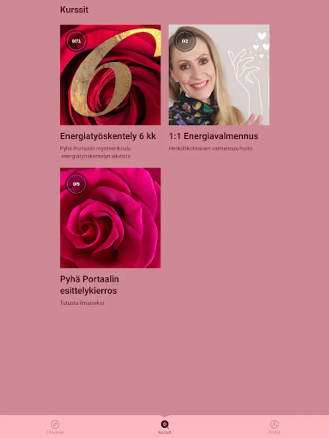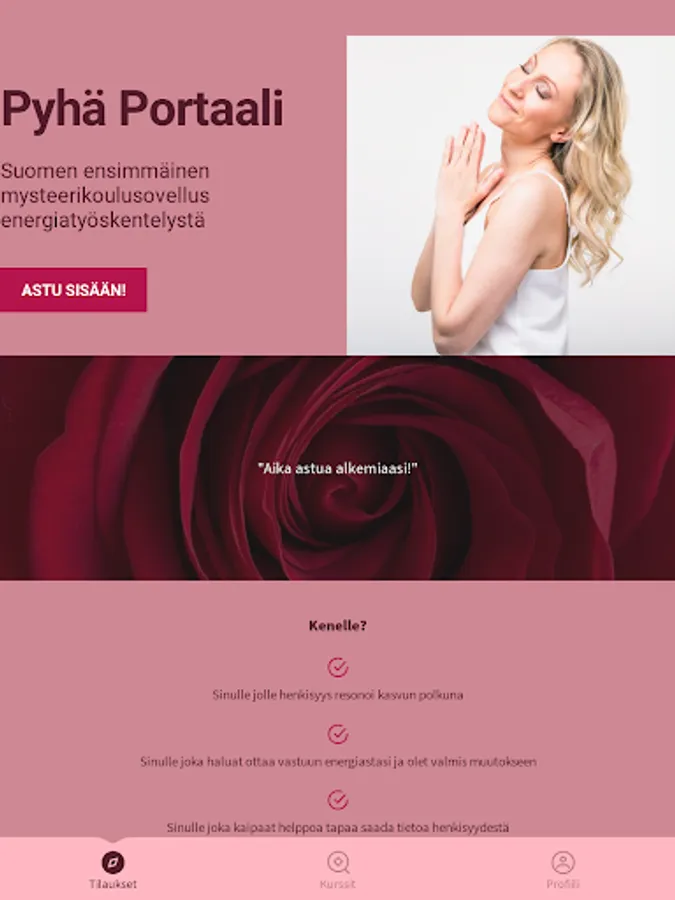 Lataa Pyhä Portaali ilmaiseksi ja tutustu esittelymateriaaliin "Ilmainen esittelykierros" -osiossa. Voit myös tutustua energiatyöskentelyn alkeet -kurssin ensimmäisen kuukauden materiaaliin ilmaiseksi. Sen jälkeen voit päättää jatkaa kurssia edullisella kuukausitilaushinnalla. Voit peruuttaa tilauksen milloin tahansa tai hakea mukaan Pyhä Portaalin intensiivikursseille tai henkilökohtaiseen konsultoivaan energiavalmennukseen kanssani. Voit halutessasi osallistua mukaan keskusteluihin Pyhittäjien yhteisössä tai käyttää sovellusta täysin privaatisti.
