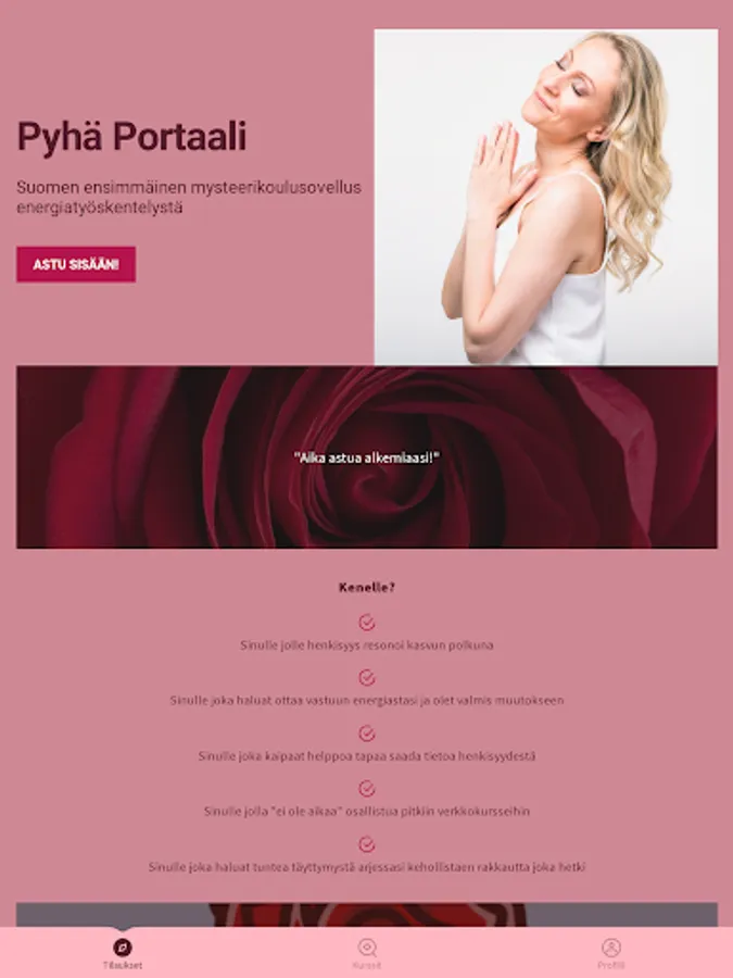Tervetuloa Pyhä Portaaliin, ensimmäiseen suomalaiseen mysteerikoulusovellukseen energiatyöskentelystä! Täältä saat tietoa ja käytännönläheisiä harjoituksia henkisyydestä ja energiatyöskentelystä intiimisti omassa puhelimessasi. Haluatko ottaa vastuun omasta energiastasi ja voimaantua tavalla, jota et olisi osannut kuvitellakaan? Resonoiko sinulle henkinen polku ja henkisyys hyvinvoinnin ja unelmien saavuttamisen välineenä? Haluatko todella kääriä hihat ja tulla velhoksi energiasi kanssa?