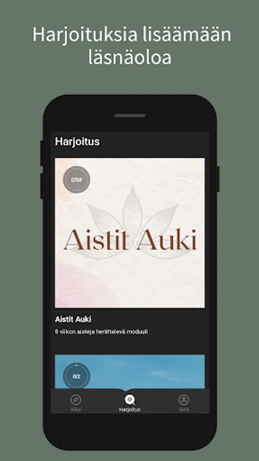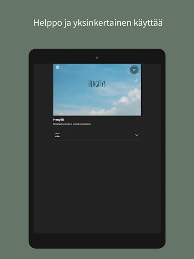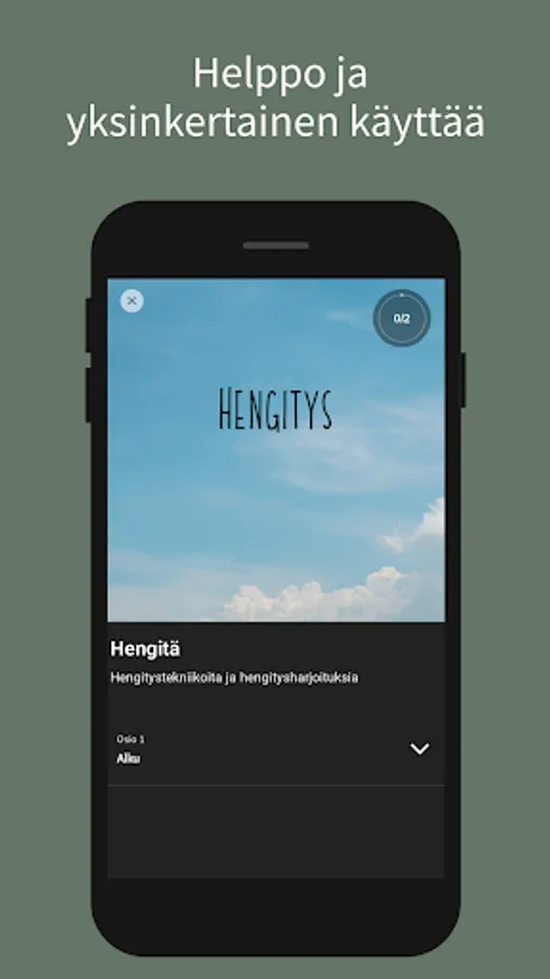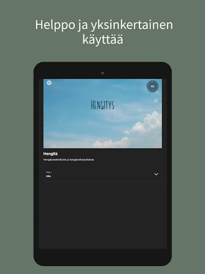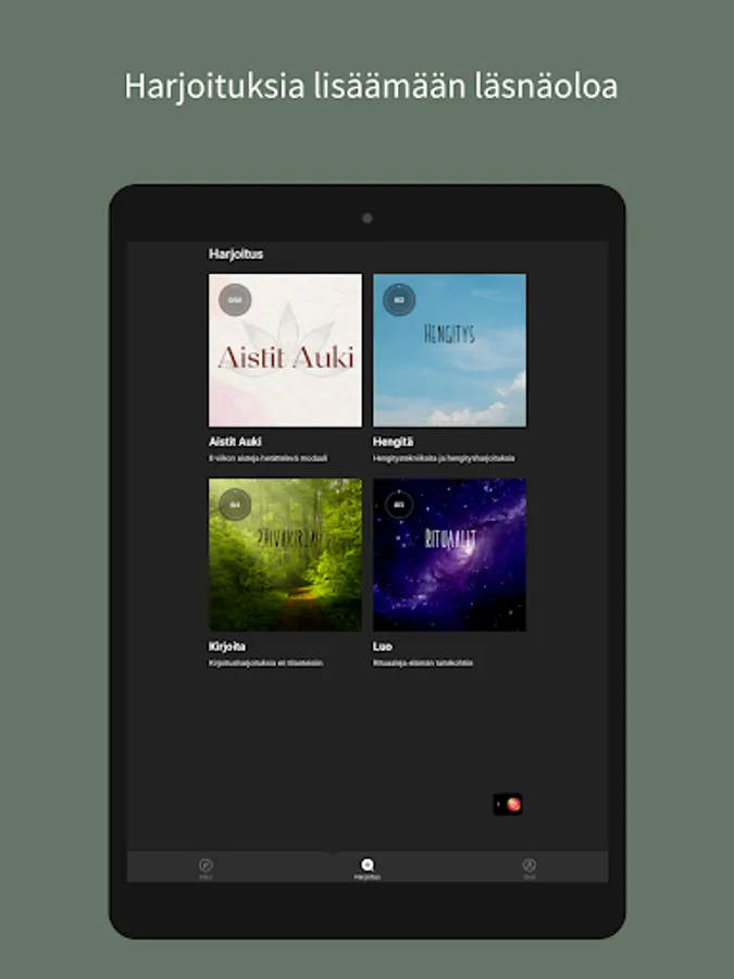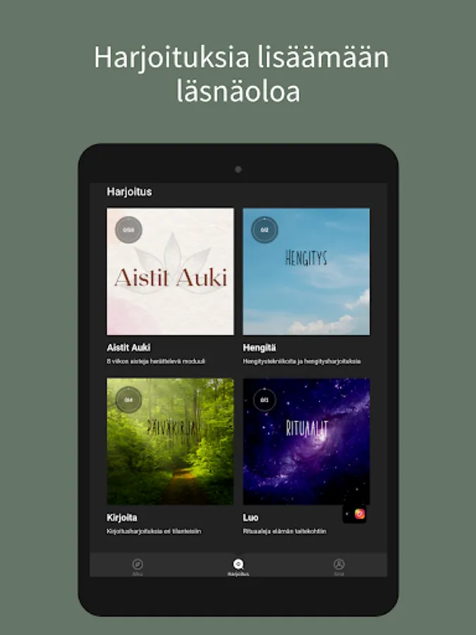 Tästä sovelluksesta löydät läsnäolo-, hengitys-, meditaatio- ja reflektioharjoituksia elämän eri tilanteisiin. Sovellus on rakennettu niin, että voit itse valita mitkä harjoituksista teet, jotta voit valita sen, mikä tässä hetkessä palvelee sinua parhaiten.