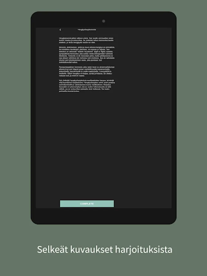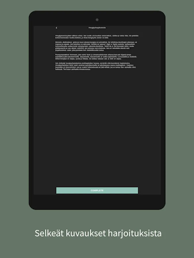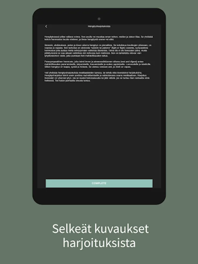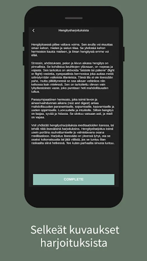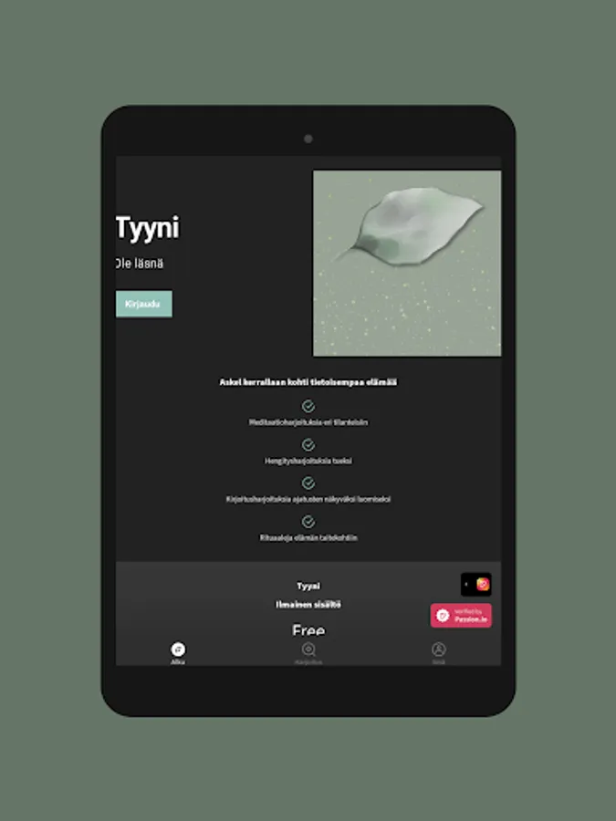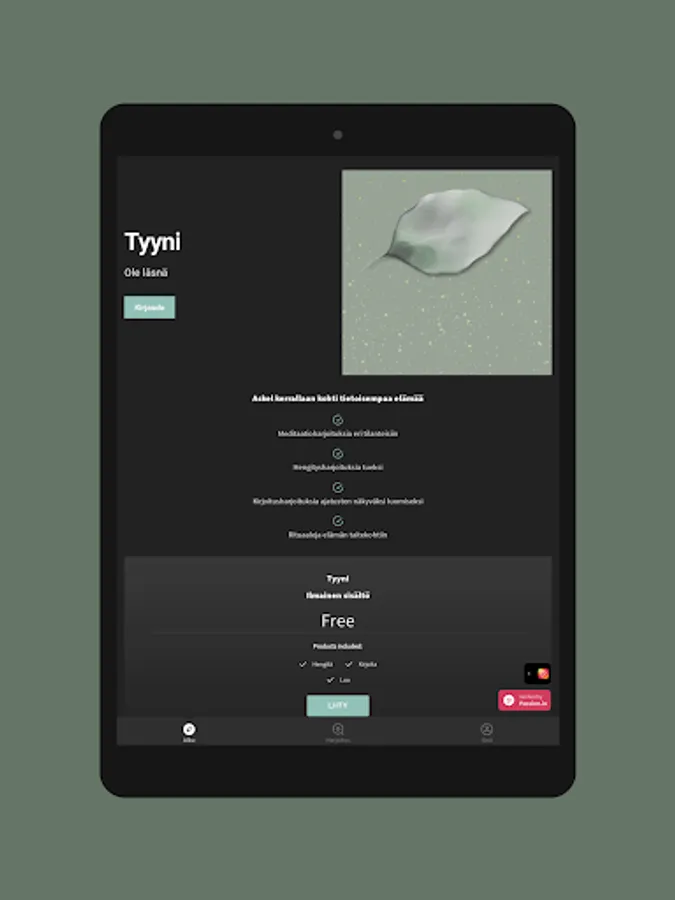 Tästä sovelluksesta löydät läsnäolo-, hengitys-, meditaatio- ja reflektioharjoituksia elämän eri tilanteisiin. Sovellus on rakennettu niin, että voit itse valita mitkä harjoituksista teet, jotta voit valita sen, mikä tässä hetkessä palvelee sinua parhaiten.