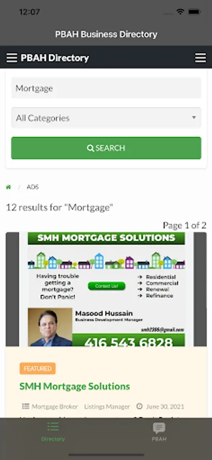 On this homepage and on the app’s landing page, you will easily and quickly search through 400+ listings by searching for a keyword, or you can select a category, press search, then look at each listing in it’s respective category. Each listing has a featured business card image, and if you open that listing, you will see other relevant images connected to that business. Further down on the homepage, you will see 6 featured listings. These 6 paid sponsorship listings are vetted and recommended by the Pakistan Business Association of Hamilton