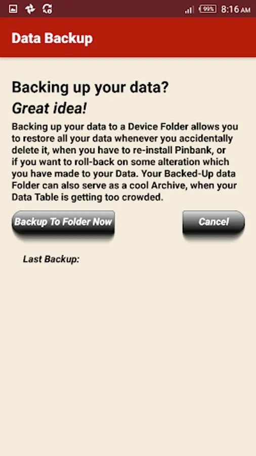 Pinbank provides options for Backing-Up your Data, and Restoring your Backed-Up Data, whenever you need it. So loosing or damaging your Device does not mean that you have lost your Data.