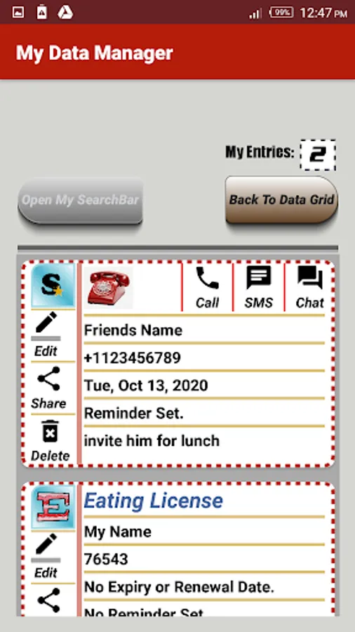Pinbank gives you a convenient place on your Android Device, to manage these and other similar types of Document details. With Pinbank, you can easily store and retrieve Document details. You can share your Document details by sms or WhatsApp, and you can even set Reminders for Documents that need to be renewed periodically.