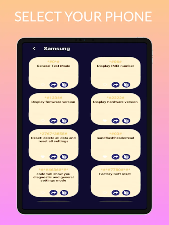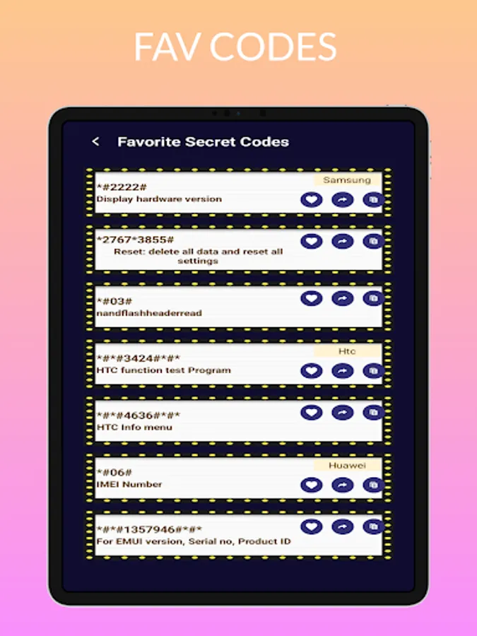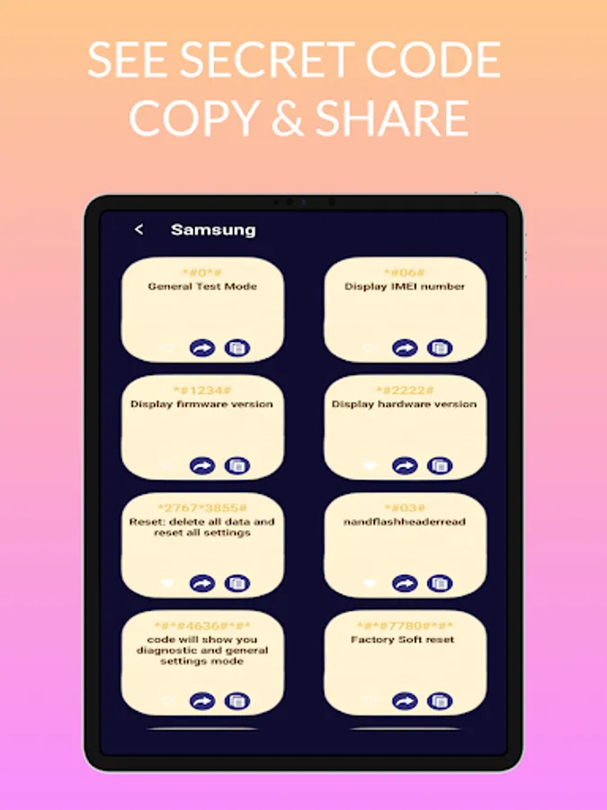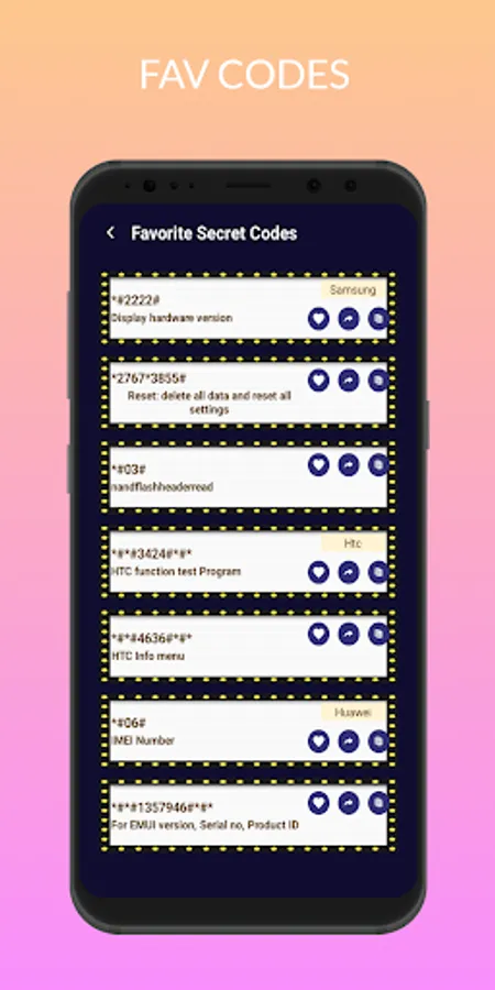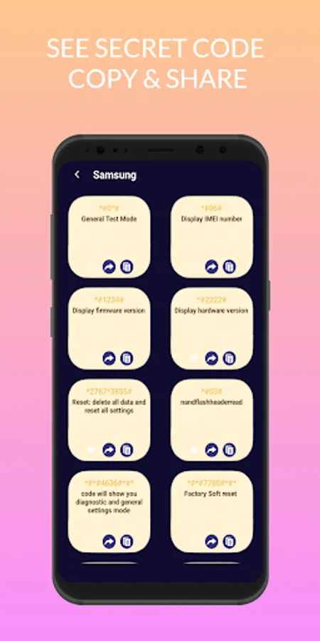 —Dial all these codes directly from the app or copy codes and paste in your dialer to get the information. —Share and mobile secret codes from the app. —Copy codes. —Add to favorite your most used mobile secret code. - Get latest secret tips and tricks of android phones.