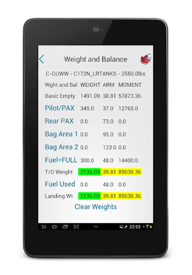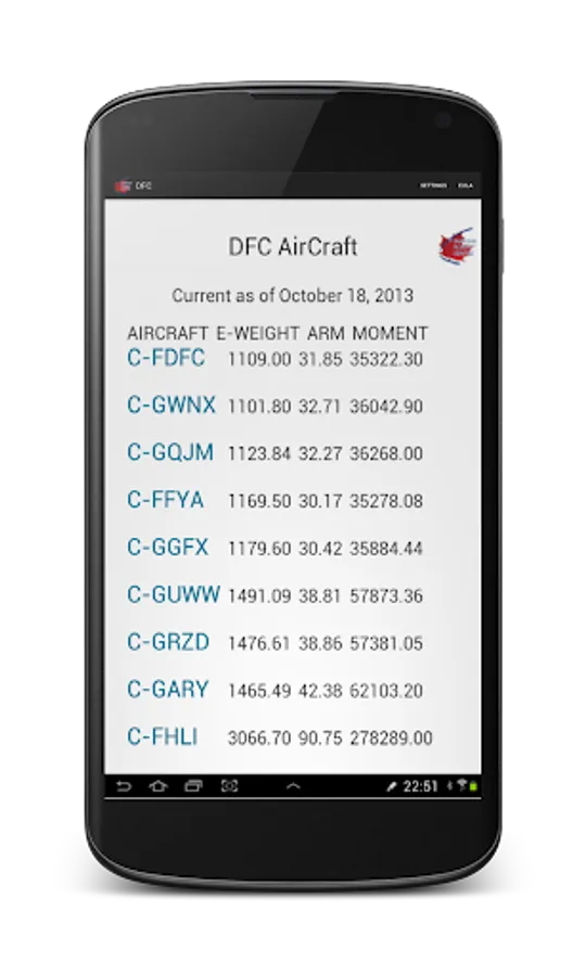 Durham Flight Centre weight and balance calculator is specific to DFC planes. The app holds the current basic empty weight, arms and moments of each DFC plane. If the BEW or Moment for the plane changes, the app will be updated and distributed to the pilots who have the app on their Android device and the device is able to receive updates.