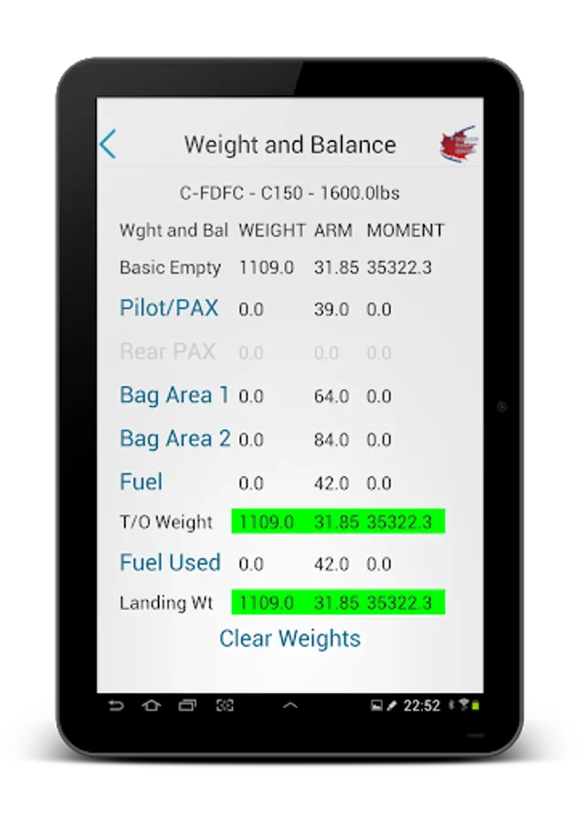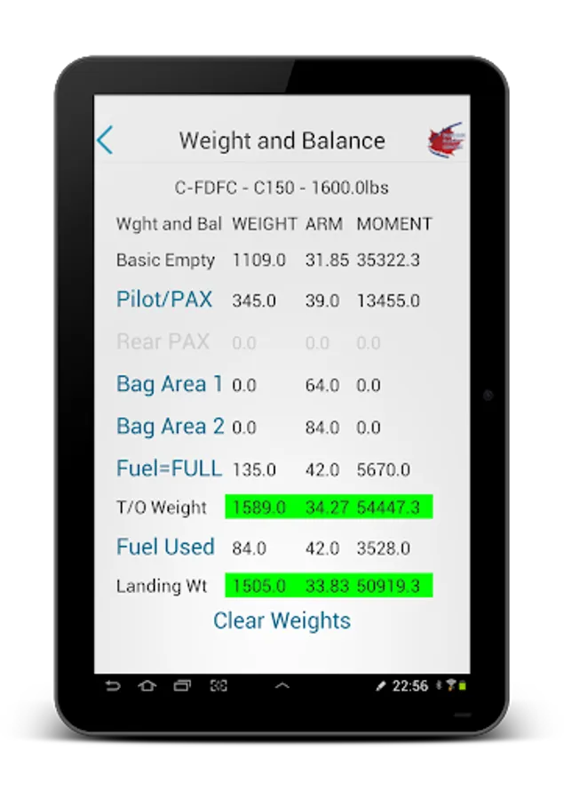 Pilots will pick a DFC plane and enter in the weights(pounds) for the pilot, passengers, fuel (gallons) and baggage. The app then calculates the moments for each arm and verifies if you are within or out of limits for weight and center of gravity. If the Fuel Used (gallons) section is filled out then a landing weight and C of G is calculated for you. A simple colour code lets you know if you are within the weight and C of G limits.