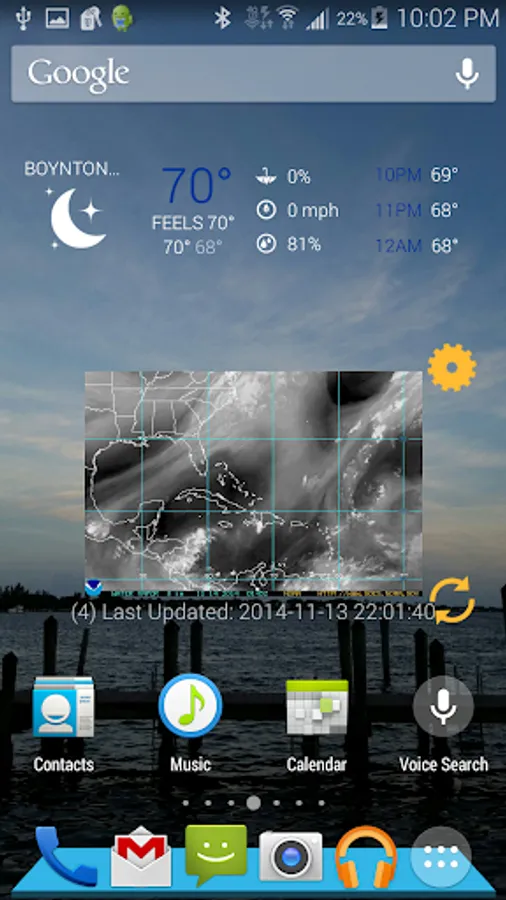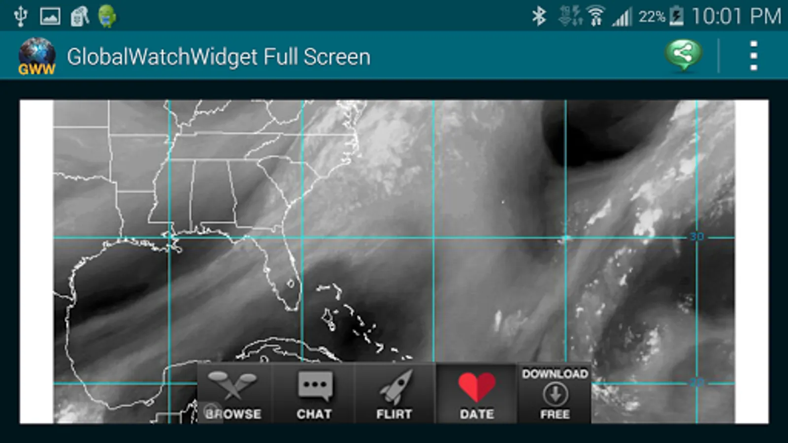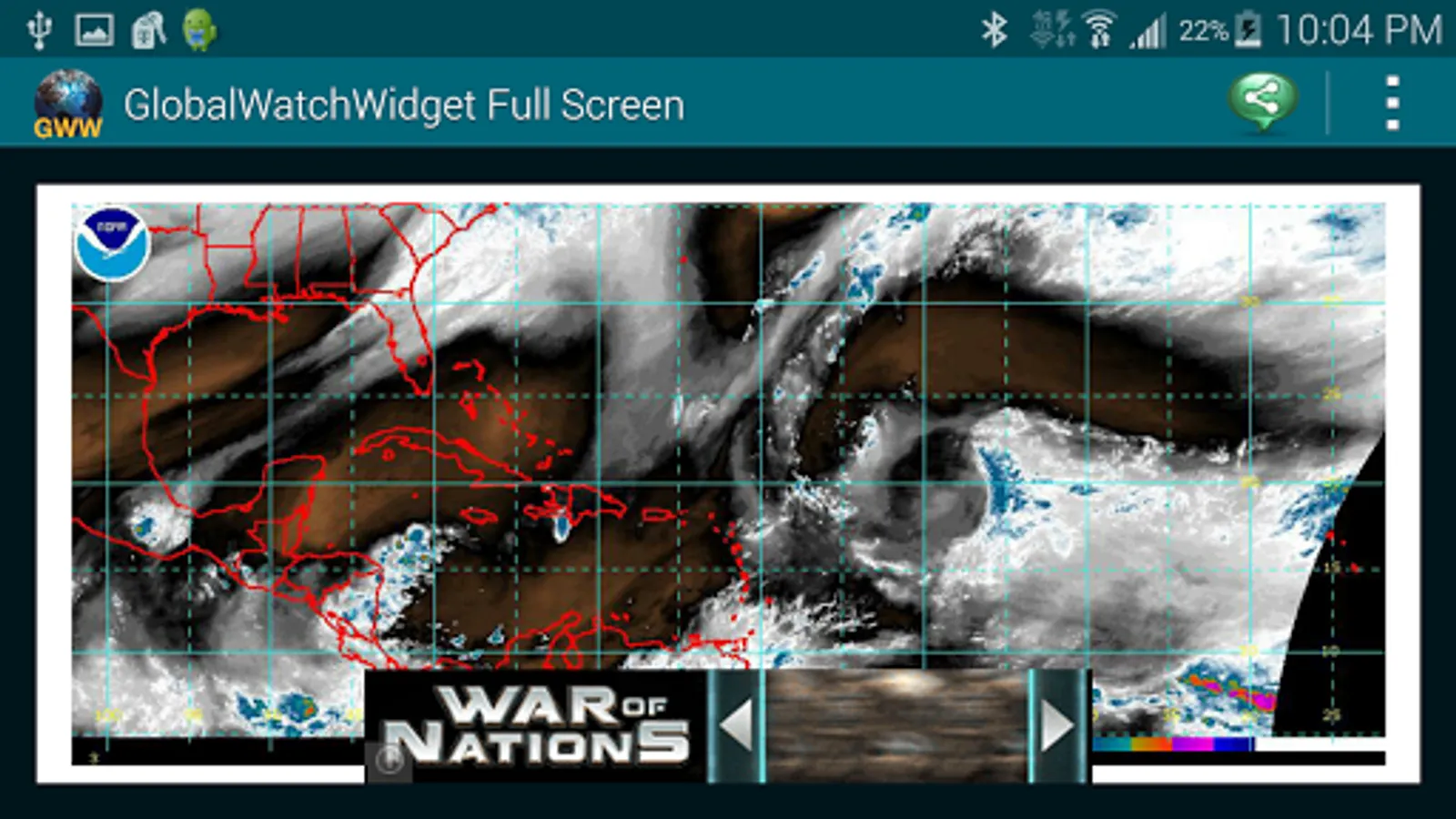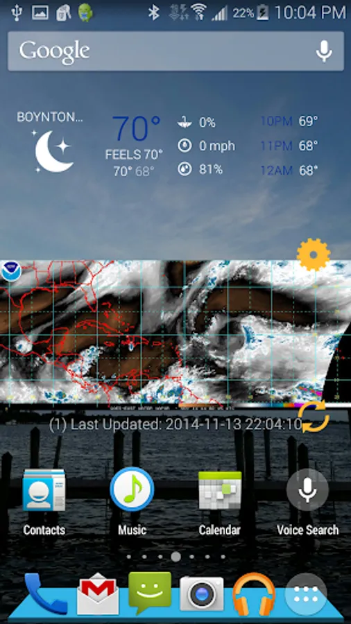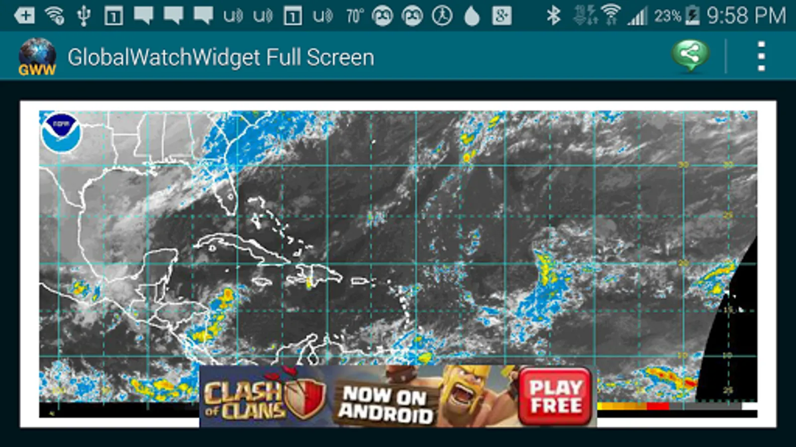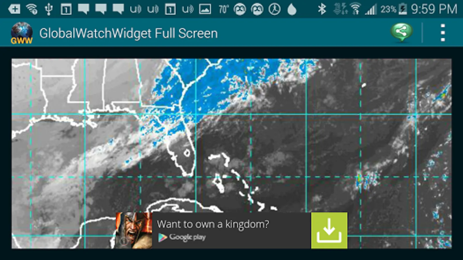 Select from a list of Satellite Images from NOAA for your Android desktop. You create your "playlist" from the list of images from NOAA Satellites including visible, infrared, and water vapor, and it will change the picture on your desktop every 30 minutes automatically, but you can also click to change at any time.