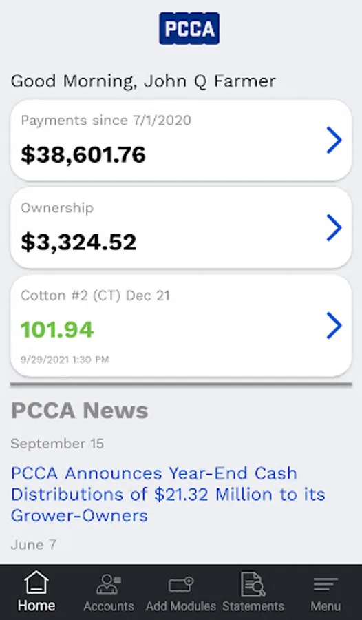 The myPCCA app allows grower-owners access to important information regarding their accounts with PCCA, gin account information, cotton statements & payments, and the latest PCCA news & information. Users can turn in modules to participating co-op gins as well as electronically sign PCCA documents and accept PCCA Direct bids.