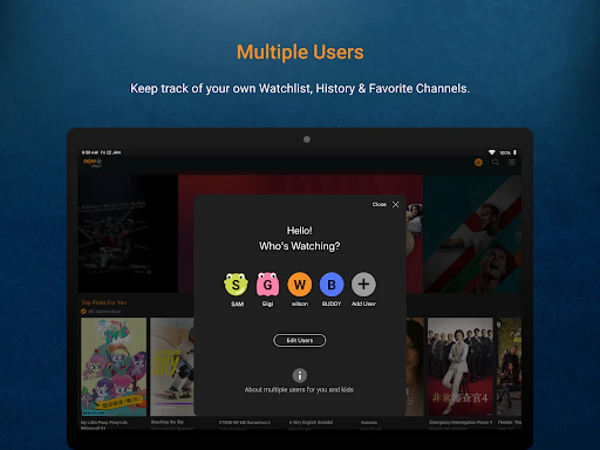 Add users to keep personal watchlist, history and more for you and your family, synchronized across TV and Now Player devices. You can have up to five profiles within a single Now TV account.