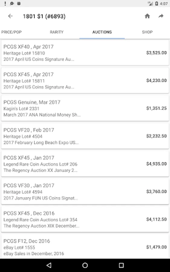 * Over 3.2 million auction prices realized from PCGS & NGC graded coins, pulled from over 5,800 auctions, including Heritage, eBay, Sotheby’s, Christie’s, Bonham’s, Stack’s Bowers, Legend Rare Coin Auctions and others.