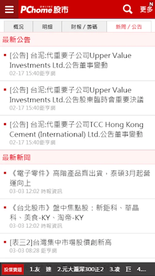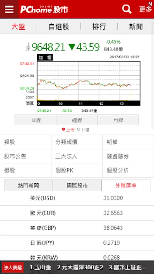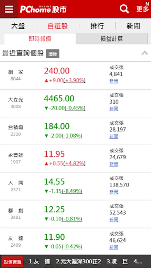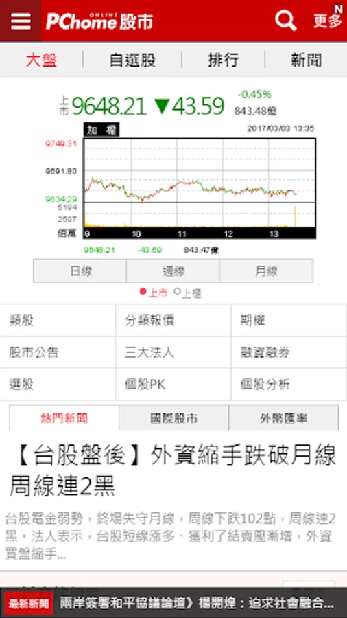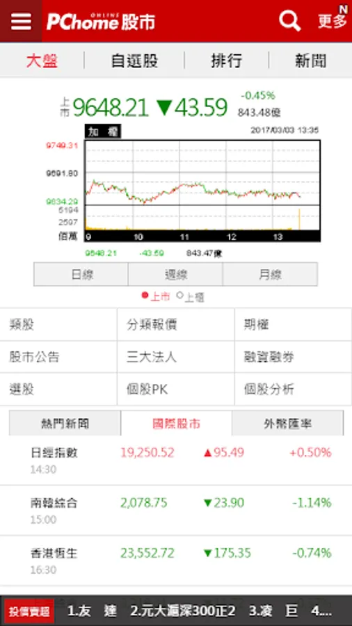 PChome股市提供台股當日行情、大盤走勢、期貨及選擇權報價、國際股市、匯市、財經新聞、盤中選股等資訊。