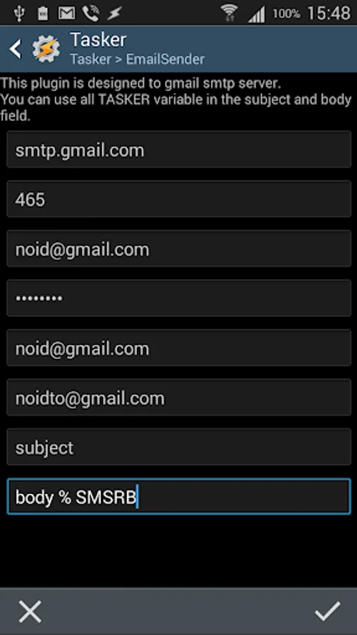 You have to select Tasker Email Sender in the plugin menu, and set all information field.